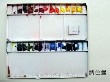 专业级乾水彩片的颜料盒,在色盘的下面有一个环,用左手大拇指套在环中以端住调色盒,像一个调色盘一样。