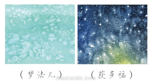 通过对比在木浆纸和棉浆纸上的撒盐效果,可以看出受水彩纸的吸色特性,木浆纸上撒盐边缘痕迹较明显(梦法儿为木浆纸)。