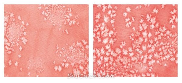 用不同的牌子或颜料制作撒盐效果,会发现肌理效果呈现的不同,主要是决定于颜料的扩散性,用扩散性好的颜料能制作出漂亮的撒盐肌理。