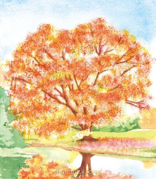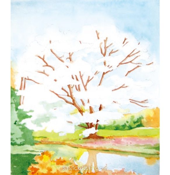 STEP1:将大树周围的景物和枝干画出,与大树相接的天空和间隙,用湿画法模糊边缘上色。