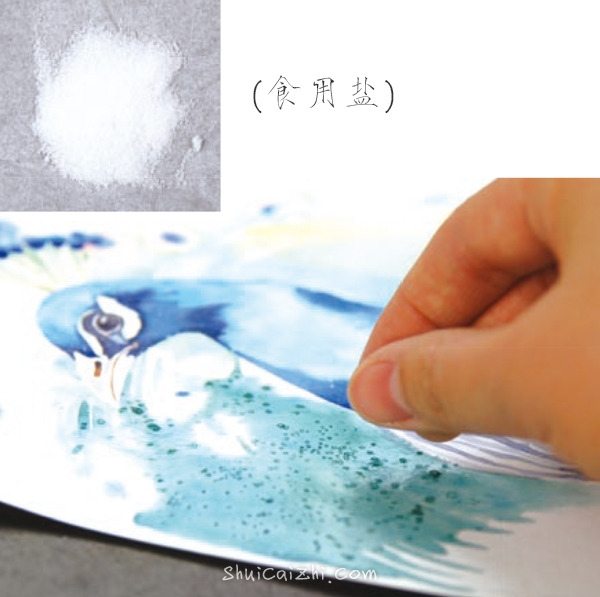 STEP3:趁画面湿润时,赶快将食盐颗粒撒在画面上,静待其反应。