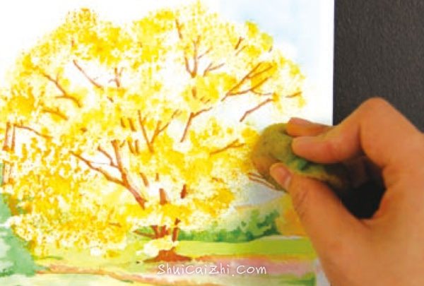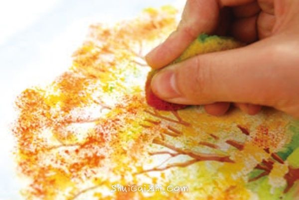 STEP3:沿着枝干,用蘸了颜料的海绵在画纸上按压,调整海绵的大小和按压力度,做出肌理效果。