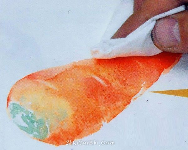 5、越是认真描上筋等细节,越能强调胡萝卜的实体感。水彩颜料变干后,水彩画笔上蘸水涂筋软化颜料。用棉纸轻轻蘸去水彩颜料。