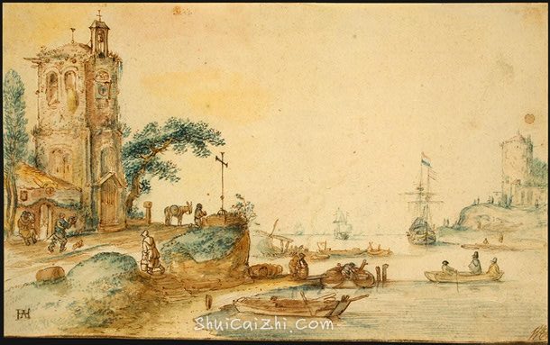 水彩画入门教程本期展示的三幅水彩风景画作品:《楼塔景观》、《河边风光》、《溜冰场一景》;均出自荷兰著名风景画家亨德里克艾维坎普(Hendrick Avercamp)之手,