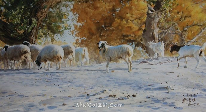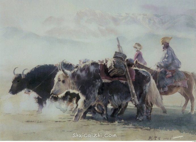 画西藏、画新疆、画青海,他的画面色彩非常丰富,水分运用恰如其分,浓、淡、干、湿以及冷暖关系处理得十分娴熟、巧妙,善于运用水分来塑造形象。造型扎实、稳健、端庄,扎实的功底,气势浑厚的场面,充分细腻而细节,使其水彩画具有油画的凝重感。