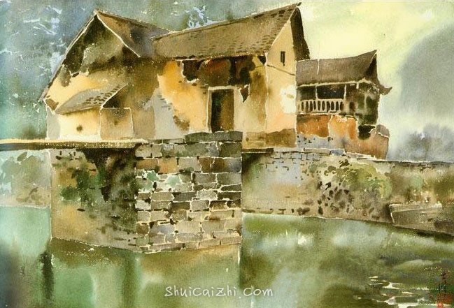 陈士修水彩村庄风景作品1