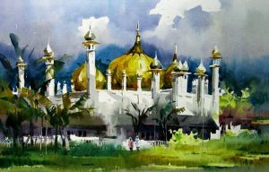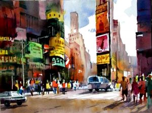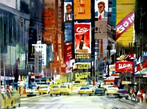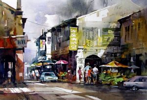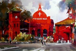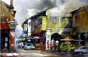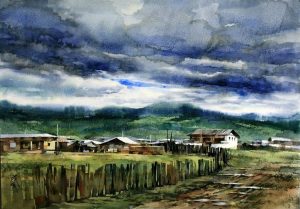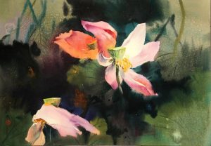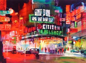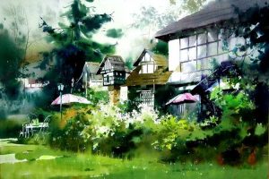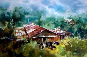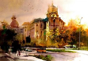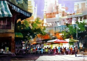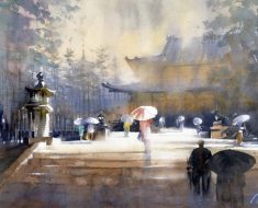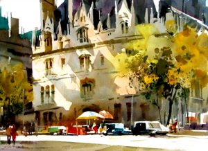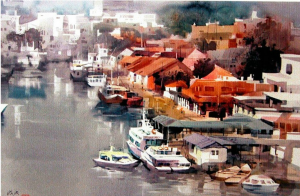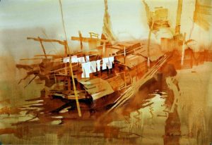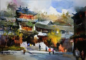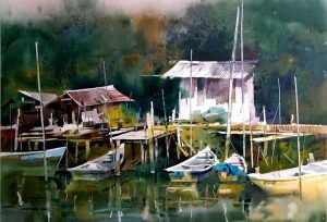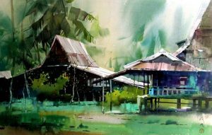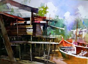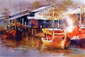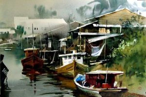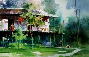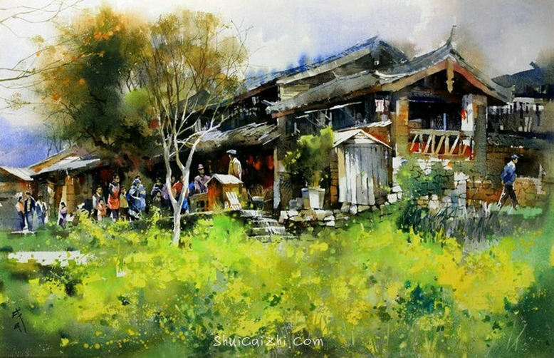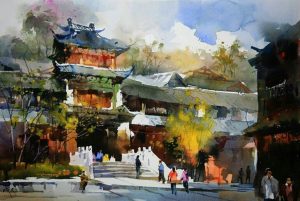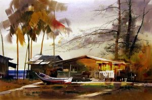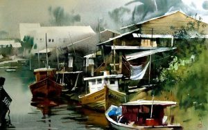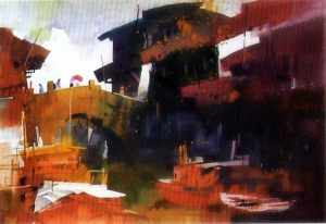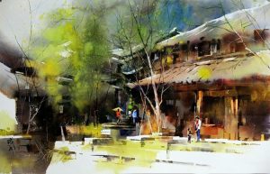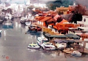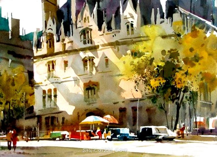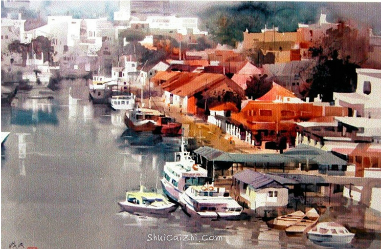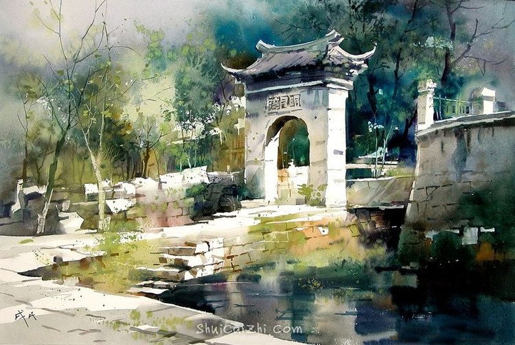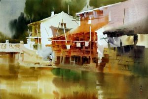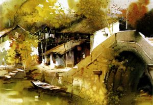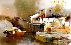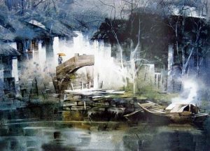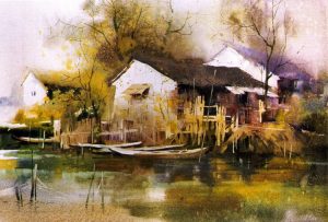 贝戌民的水彩画多以江南水乡为画题,他用色大胆、概括、强烈,朦胧水色之中,不是单纯明暗的变化,而是色与色的交融。他在冷暖色彩的变幻中造型,在对比中求取和谐,还出其不意的用主观色彩来表达水乡在特定环境中的瞬间变化和情调气氛,这种色彩的飞舞和跳动,正是贝戌民内心真情的流露和个性的体现。贝戌民以纯熟的技巧、清丽的画风和潇洒的用笔,驾驭着水与色在画纸上的流淌交融,使他的水彩画独树一帜,达到较高的艺术境界。读他的作品,无疑是一种美妙的艺术享受。