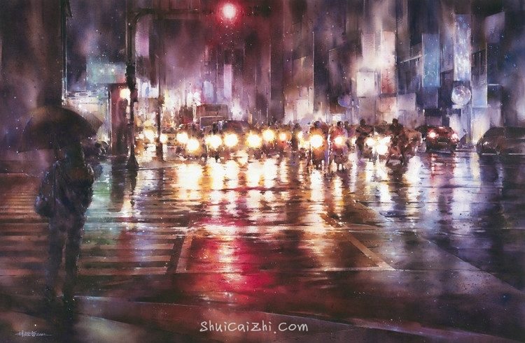 台湾画家林经哲雨夜光影水彩画作品-9
