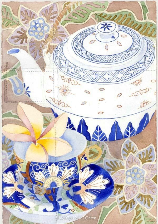 新西兰Mango Frooty青花瓷花卉水彩插画-39