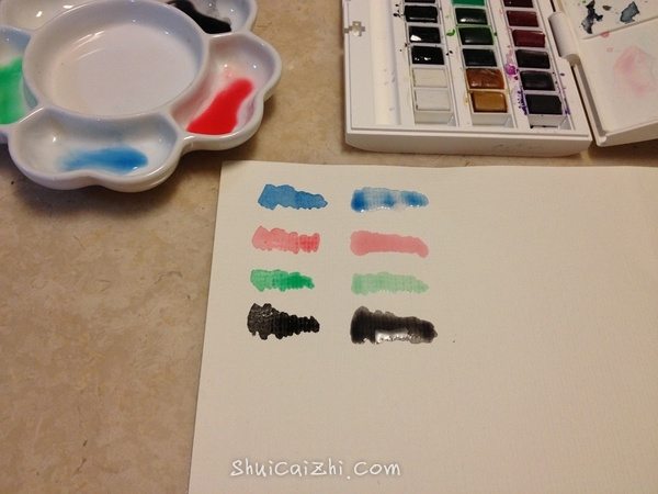 很多欧美水彩颜料自带牛胆汁,用于提高透明度,打破水表张力,消除边界感,过渡自然。直接调入水彩颜料,会产生类似在生宣上的晕染效果。对于表面胶质过重的水彩纸,要想提高颜料附着力,就加入牛胆汁即可。不过,牛胆汁同时会使颜料快干,干后的颜色会偏灰。