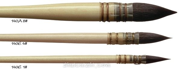 德式尺寸,中等笔锋,较尖。选用纯红貂毛制成,银色镍箍,樱桃红色的短杆画笔。