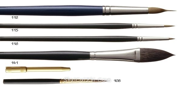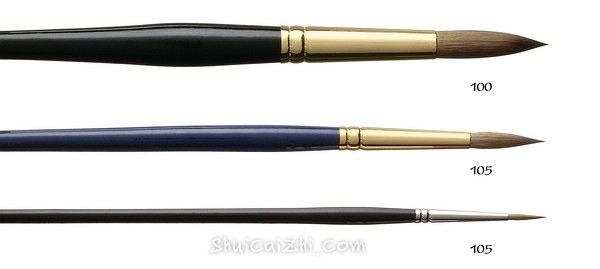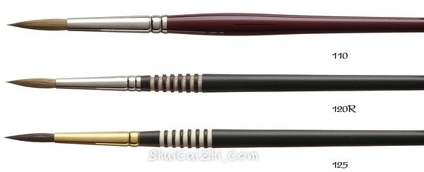 水彩画笔,细节刻画笔,笔锋中等长度较尖,笔肚饱满。笔毛与110相同,银色镍箍,黑色的短杆画笔,独特的防滑环设计,长得很好看。105系列的平价版。