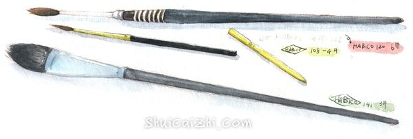猫舌笔,选用纯松鼠毛画笔,弹性不错。银色镍箍,黑色的短杆画笔。吸水性好,适合作背景铺色使用。