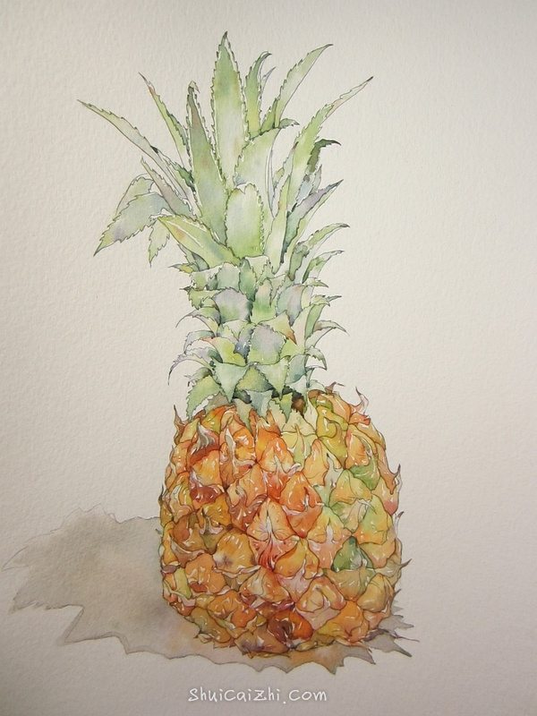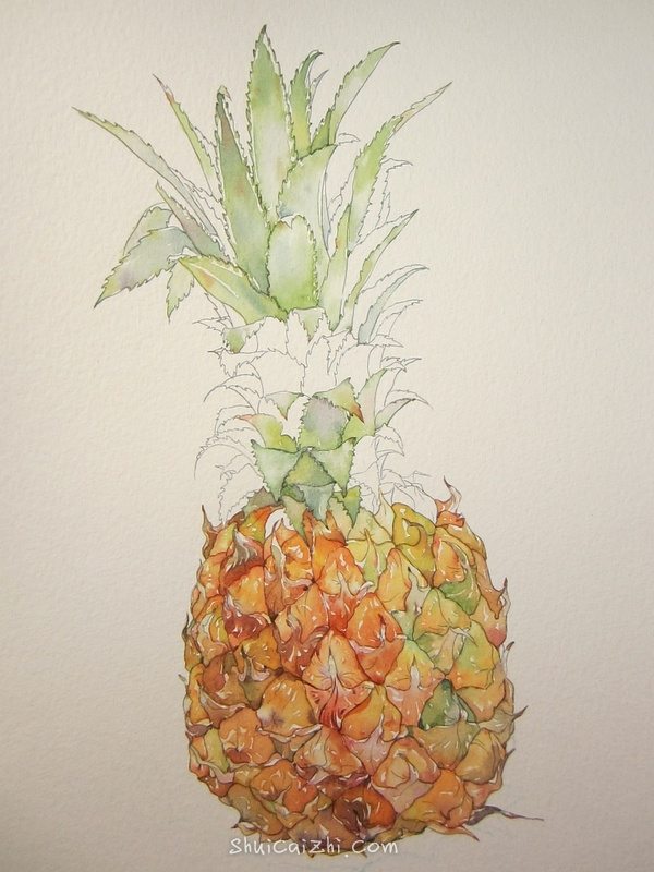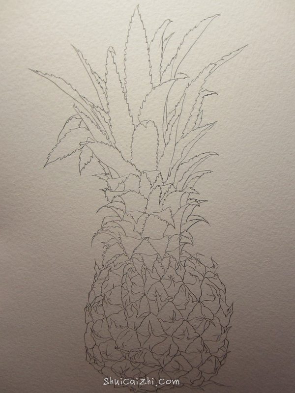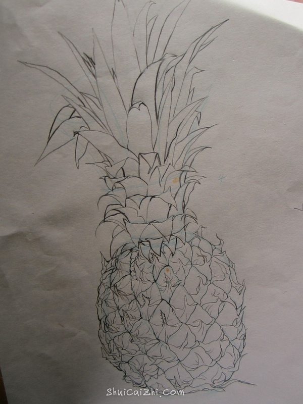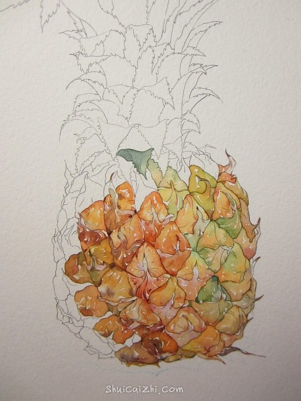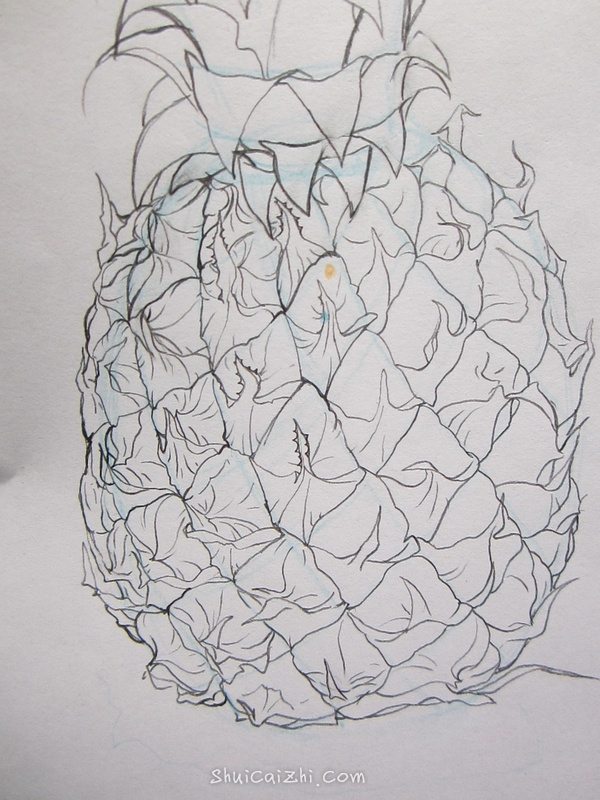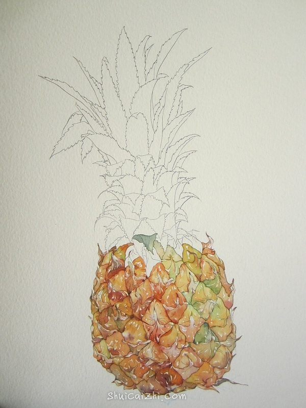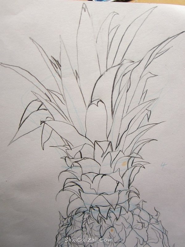 等到发现有点麻烦时已经晚了!!!!本来我计划按着Billy书上教的,先打一遍草稿,再用拷贝纸描下来,再在拷贝纸背面涂上铅,然后在水彩纸上压一遍印子,再在水彩纸上整理一遍铅笔线来着。可是我草稿刚画了几个块块我就后悔了!因为菠萝好像没有风信子难画耶!风信子我都没打稿这个为什么要打啊。。可是我又不舍得已经打了的部分。。于是坚持画了下去。。