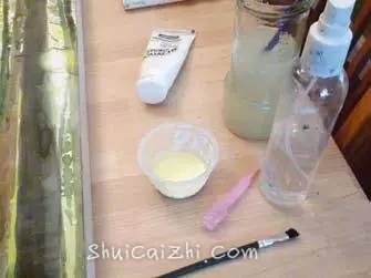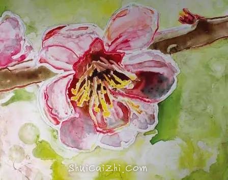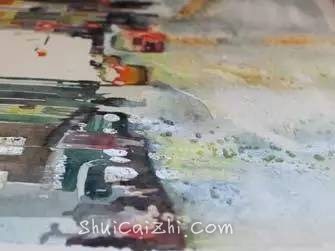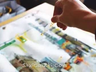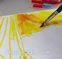 用水调好白色的水粉,形成半透明的白色混合液,这样水粉的颜色可以在水彩上显现出来,又不至于遮住画的其他部分。