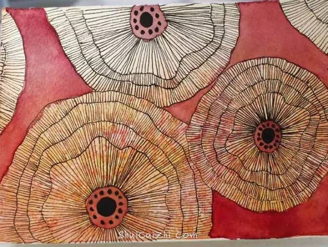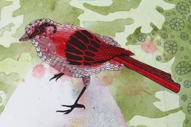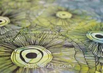 后面的作画过程中,你可以考虑用水溶性蜡笔勾勒出这些图案的轮廓,并且将每个图案里面涂白,从而使图案在完成的画作中更加明显。