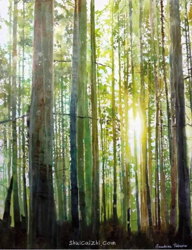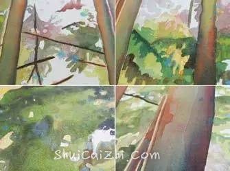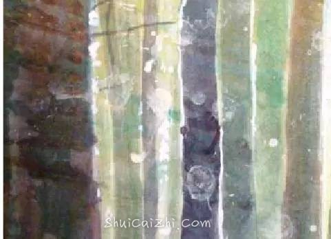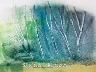 在水彩未干的时候,我用画刀将水彩刮除,刻画出淡颜色的树枝。