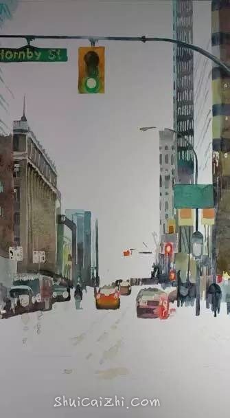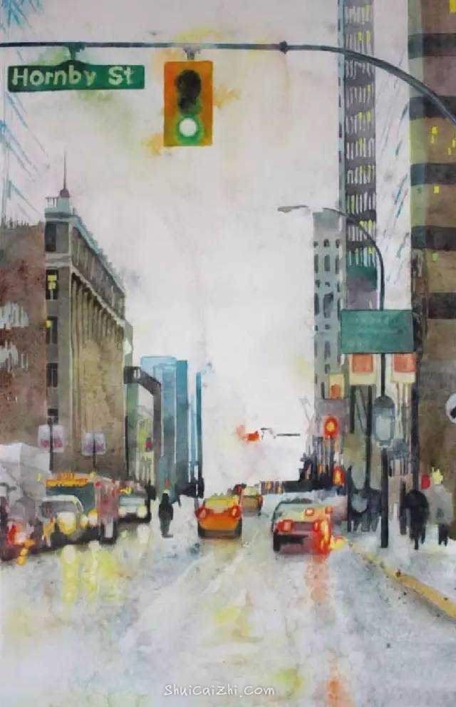 在绘画中用盐添加肌理的方式多种多样,这幅图中盐被运用到温哥华城市风景雨后的人行道上。