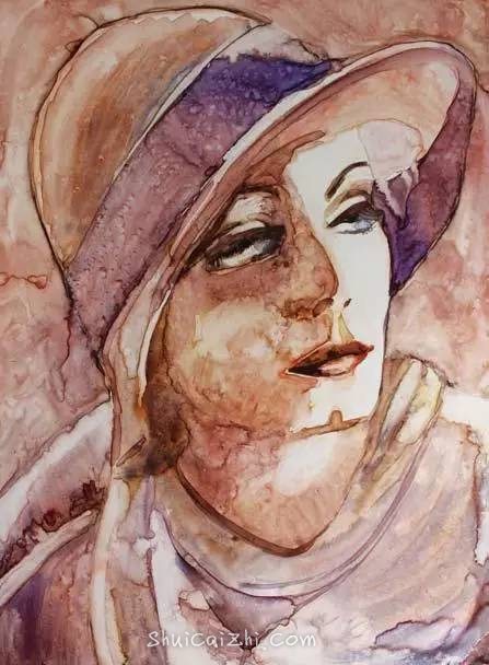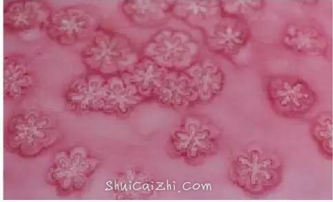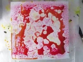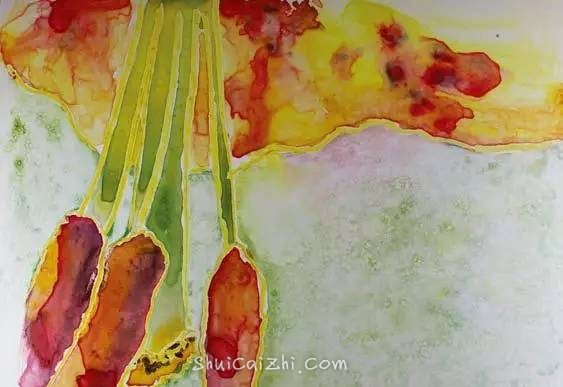 几滴酒精加入到了湿水彩涂层中。酒精使颜料溢开,在中间留下了稍有些暗的区域。