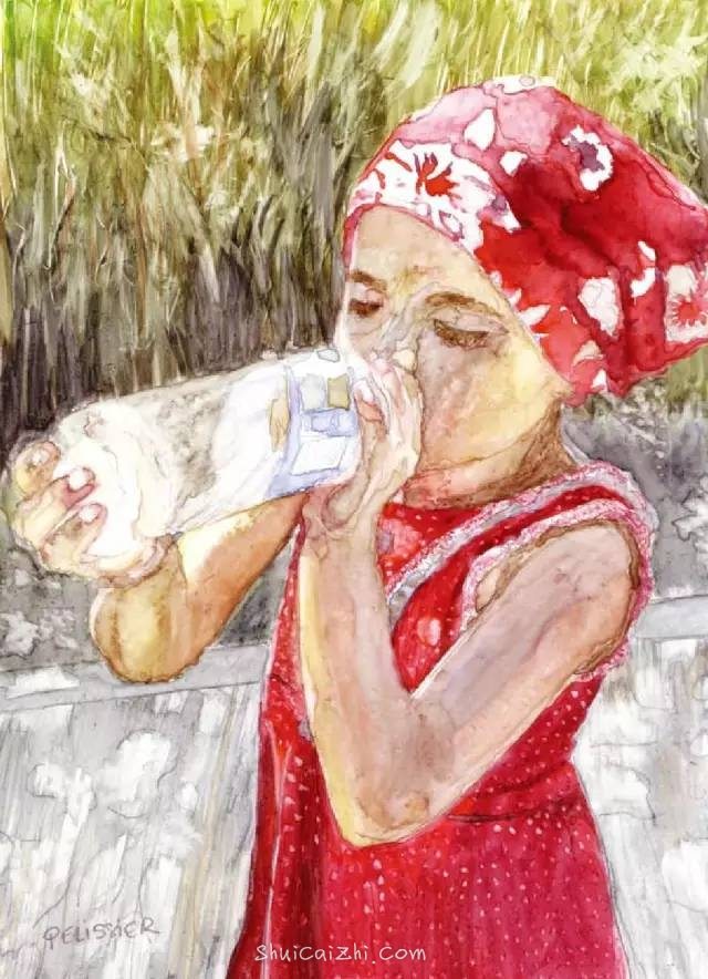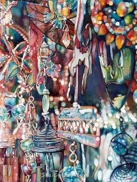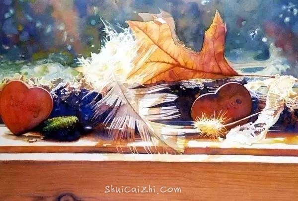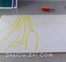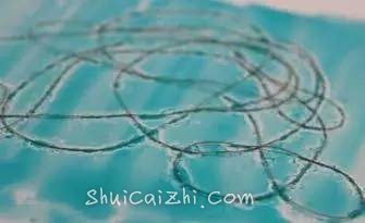 其他放在湿的水彩涂层上的材料也可以留下痕迹,从而产生有趣的肌理。这幅画中在合成纸的湿水彩层上放上了一条线。颜料干后将线拿掉,会在画上留下有趣的肌理。
