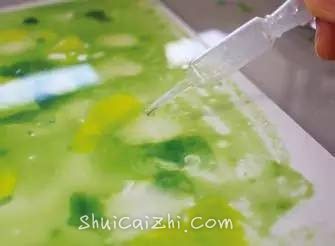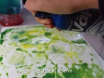 加入更多的喷溅效果。这幅图中,在白色滴变干后,我喷溅了一些绿色水彩。