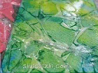 在普通水彩纸的湿颜料涂层上覆盖保鲜膜,让颜料彻底晾干。