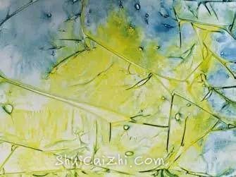 将保鲜膜包在湿的水彩涂层上,会使颜料移动并聚集在保鲜膜的褶皱处。不要碰保鲜膜盖住的画纸,让其自然晾干,就会得到有趣的几何图形肌理。