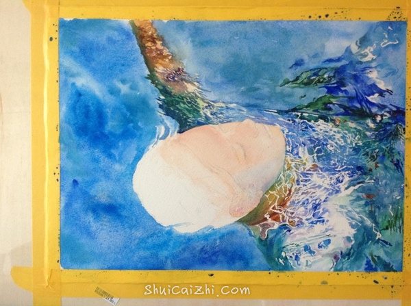 脸上一层淡肤色,及皮肤底色,注意偏黄及偏红的部分,脸部浸入水中的部分则是偏蓝偏紫,也融入一些肤色,使脸部不被分割的很明显。擦掉留白液,刻画手臂及衣物。这里其实没啥技巧可言,就是耐心,因为留白胶肯定不可能留那么细,还是得靠画的时候自己注意留白,不能过多繁琐也不要太大块没有细节。需画画调整一下,也不要太死扣,注意画面的整体感。到这一步其实手臂及衣服部分画了至少三层,只是没有拍。