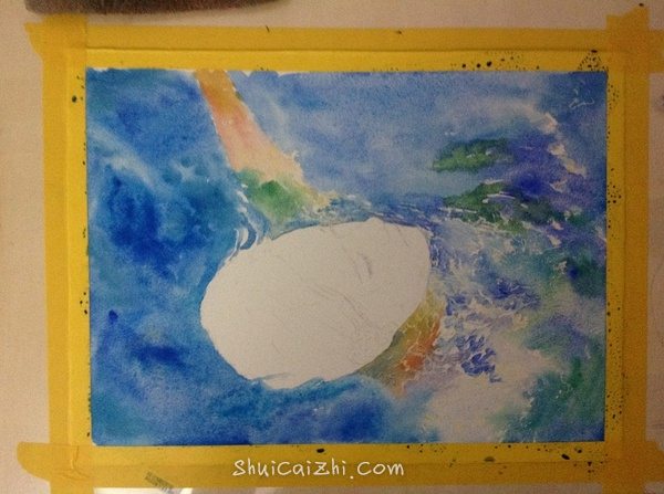 线稿没拍,先上留白液,高光留白。然后除了人物面部及头发其他地方刷水,水量不要太多,因为有手臂及脖子等地方为肤色,水太多的话晕染太过就不好了,注意干湿衔接。用大笔铺色,基本上是蓝色,主要用了锰蓝酞青蓝,少量紫及绿。肤色则是柠檬黄少橘加玫瑰红,其实我不太记颜色名字色号什么的,只能说个大概。到下图这样基本第一遍混色完成等干,可以睡觉了。