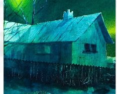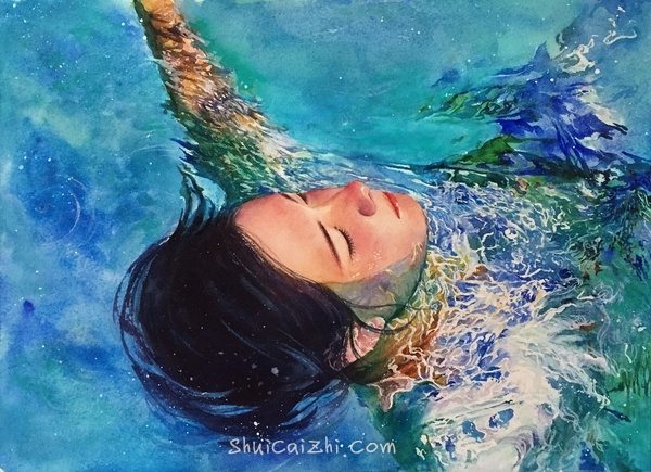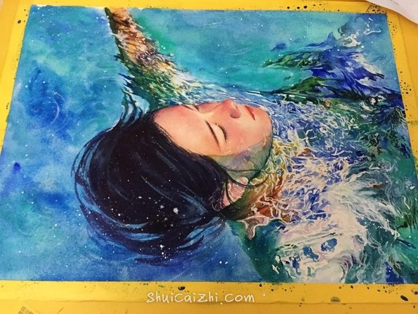 继续面部的刻画,依然是少量多次,该深的深,像鼻头脸颊额头等部位会比较偏红颜色较深,这样体积感比较好。五官的塑造,以及头发,颜色要深,这样五官才能跳出来。头发要留有空隙不要一个颜色糊上去,靠近面部偏黄,靠近水面稍浅偏蓝紫。然后就是整体颜色的调整了,水面中偏蓝绿的部分用的HB古彩颜料,因为这个颜料有一定的覆盖性,可以让整个画面更整体一些,然后白水粉点点高光,喷一点点白水粉点缀一下画面,纯粹个人爱好。完工。