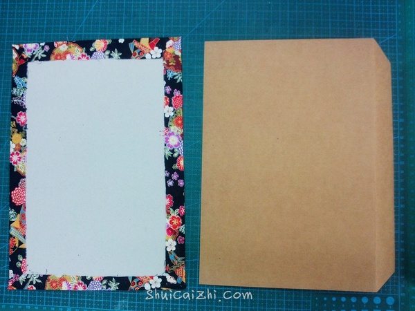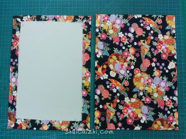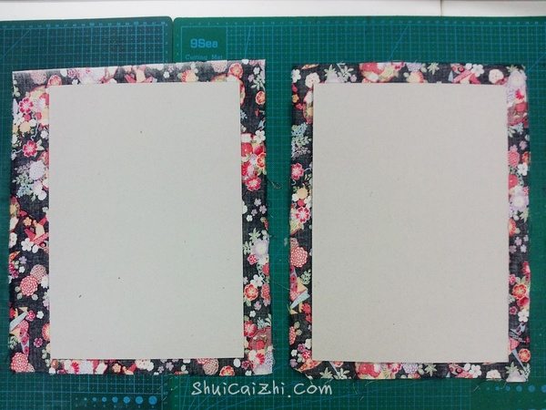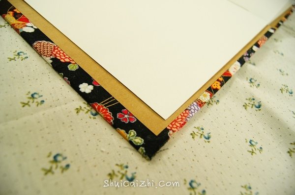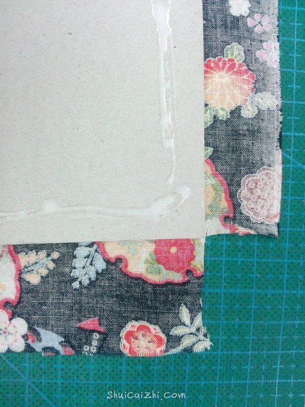 布的大小比灰卡纸大2cm左右差不多,在灰卡纸边缘涂上乳白胶,乳白胶要涂均匀。四个角可以裁掉也可以包的时候折进去。外壳完成了~