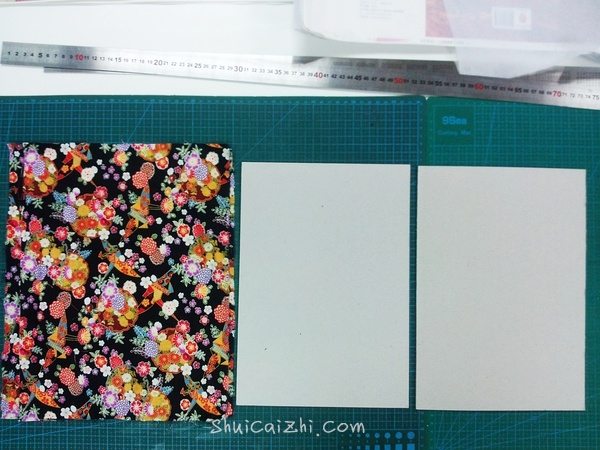 2、灰卡纸的大小其实应该裁掉一些,边缘比对折的水彩纸大5mm就够了(我忘记裁,直接包布了,凑合看吧)╭(╯^╰)╮
