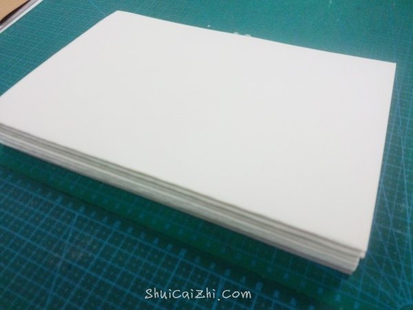 1、我做的是A4大小的本子,里面的水彩纸因为是线装所以需要对折,所以把半开水彩纸裁两次裁成8K大小,相当于A4的两倍大小就OK。纸的边缘猜裁不裁随意。裁好的水彩纸单张对折。因为水彩纸比较厚,所以一张水彩纸就够了,如果是做道林纸的本子可以可以四张一小打。我的这本总共8叠。