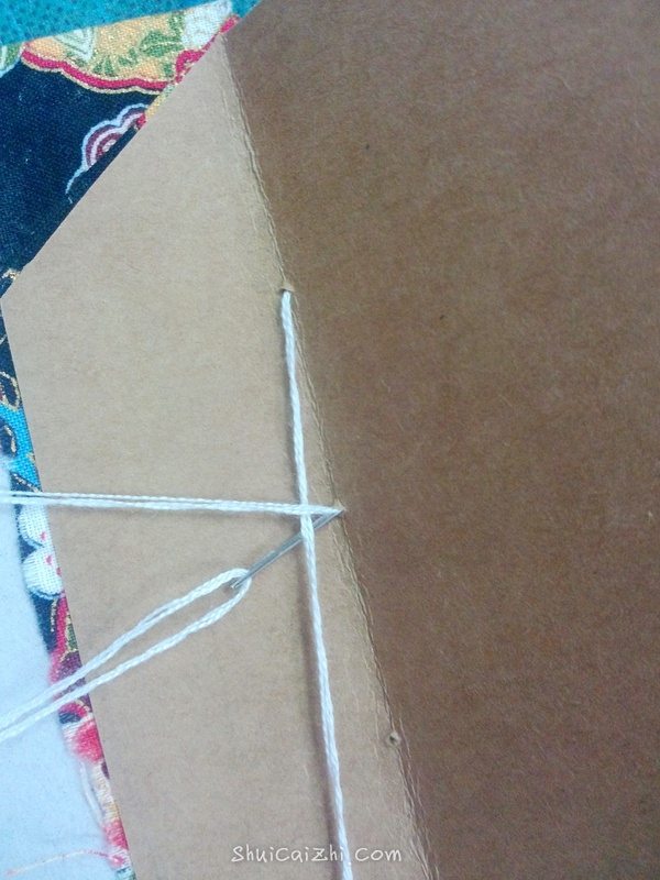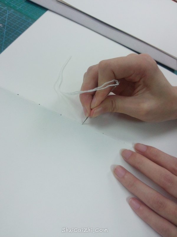 穿出之后的线传入第一叠纸的对应的孔,再从第二个孔穿出,然后穿入牛皮纸的第二个孔。