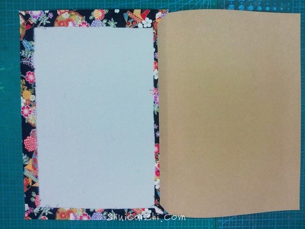 3、牛皮纸比外壳窄5mm左右,和内页差不多即可,宽度要够,因为有一部分要对折粘在外壳上。(等穿好孔之后再粘)