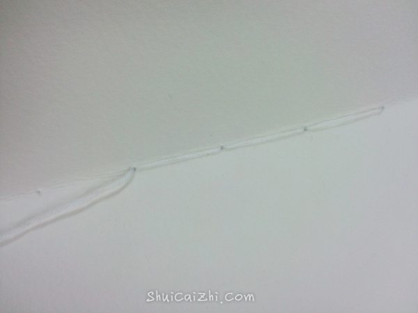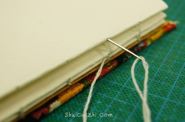 从第二叠的最后一个孔穿进倒数第二孔穿出(同之前一样)然后绕过牛皮纸和第一叠纸之间的之间的线再穿回之前的孔。然后继续这样。