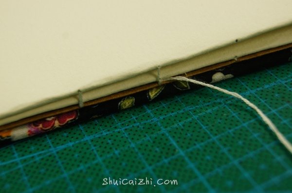 这时候我们可以去调整第一叠纸的线的松紧,尽量拉最紧,这样本子做好后才不会松垮垮。我的习惯是每缝完一叠调整一次,这样本子做好后侧面看会很好看!