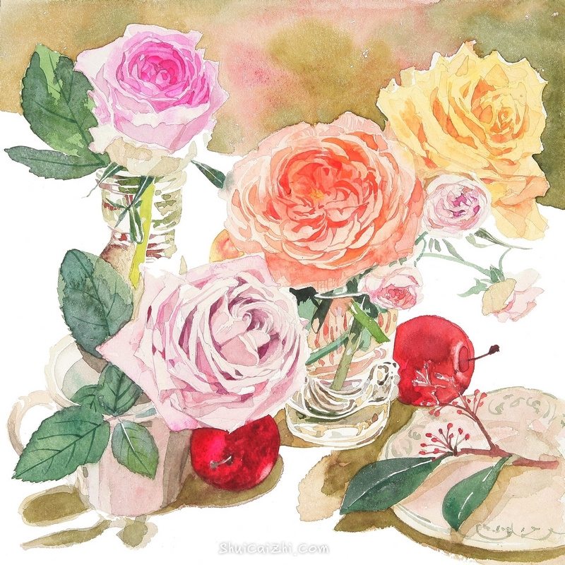 日本柘植彩子Ayako Tsuge的花卉静物水彩画-44