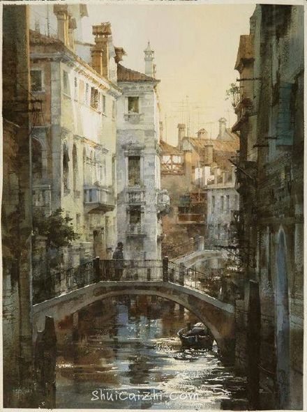 2.水彩画中的黑色以浓郁的形式出现并且与其他浓郁深沉的颜色混合在一起,这有两个好处。首先浓黑色降低了亮度,该暗的暗部得以暗下去,这样才衬托亮部的亮,整个画面就有了光;其次,与黑色混合的其他浓郁脏色(群青 熟赭什么的)让暗部不是一黑到底啥也没有,有了环境反光的感觉,暗部就不会死板。此外黑色并不是突兀的出现,而是整个画面有过渡地,亮白——中间调——深色——黑。这样虽然黑色也频繁出现,但却不会脏。