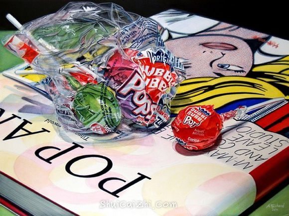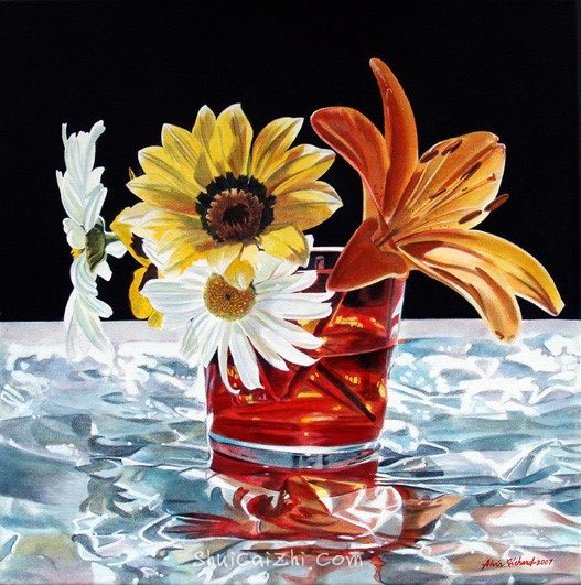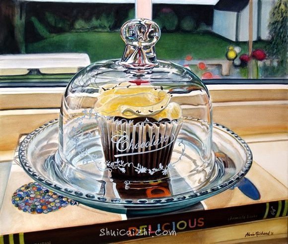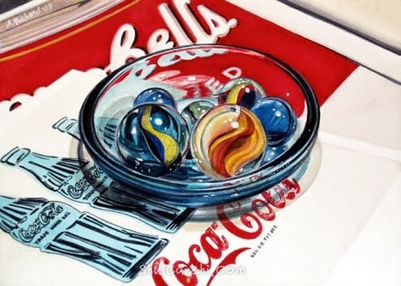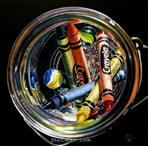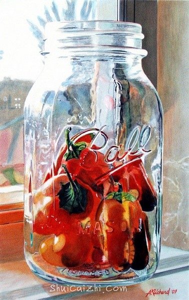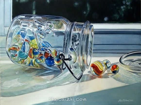 因为玻璃器皿是无色透明的,所以是没法直接画出来的,只能通过折射、扭曲、变形背后的物体色彩表现出来,还有就是利用反光,就是留白,实际就是依靠视觉的错觉来表达的,像玻璃、水、流动的水等都是这样画出来的。