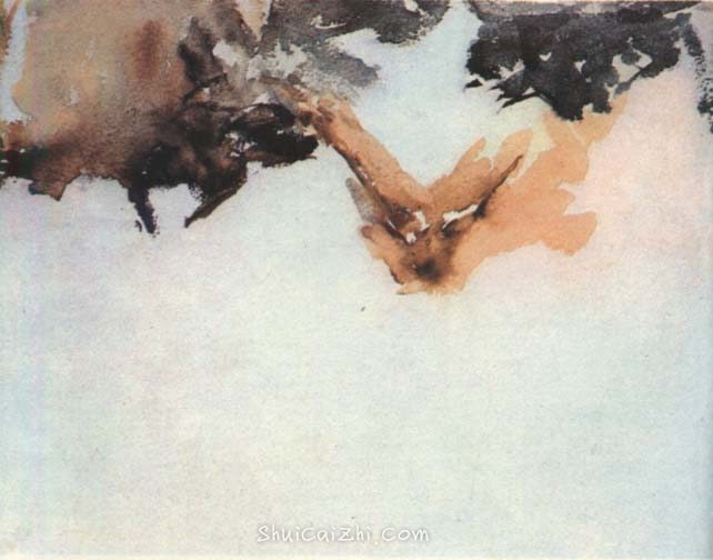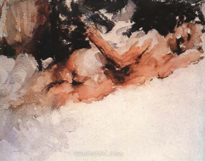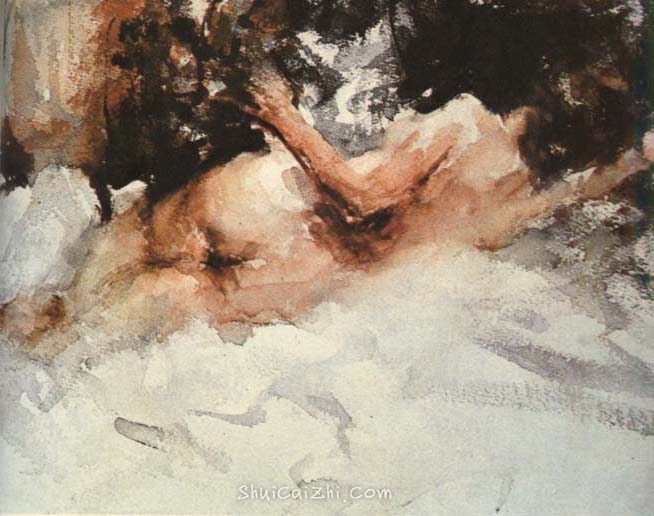 但是还有许多事:用一块大而有力的冷色点在右膝下。在冷色的白色上加进布慢的暖色及光,它起到色调之间的联系作用。用一支干净的硬毛笔吸足了水,在头发顶部擦洗,然后用干净的布团拭干这儿的水和颜色,高光就此产生了。