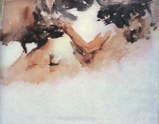 第一部;用一支18号圆形貂毛笔在干净的纸面右边画起,横切纸面铺一层粗略的浅肉色,简略地确定出人体的位置。肉色是用镉红、紫色(由白色、茜红和钴蓝调成)和赭调成。计划保留出人体上侧的冷色。