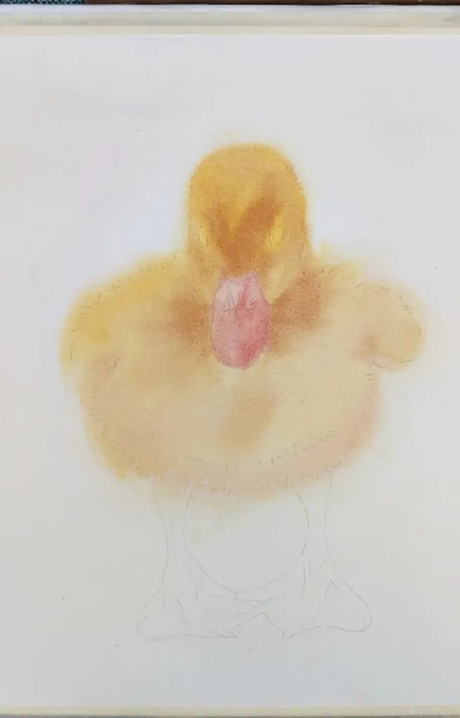 1、鸭子颜色本身是偏黄,很干净的,用色要简单概括些,不能画成一只彩色鸭子了,上第一遍颜色可以直接用中黄画出来,先用纯黄色画出亮部毛发,从头部开始,从上往下去湿画颜色~ 2、嘴巴颜色用浅红色加出来,再用…